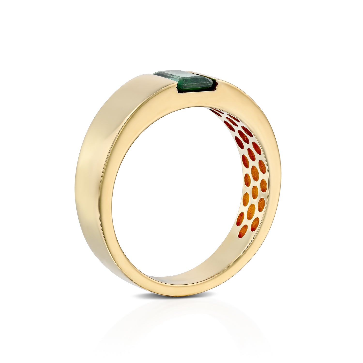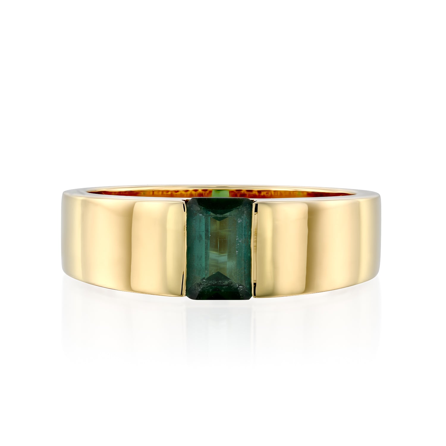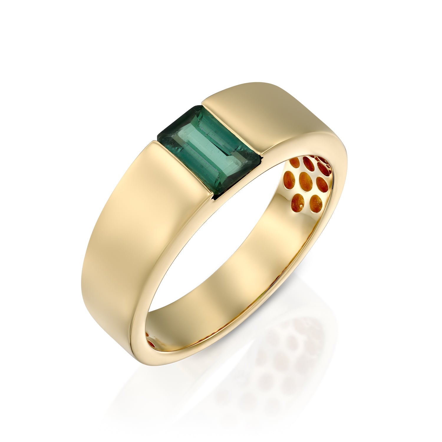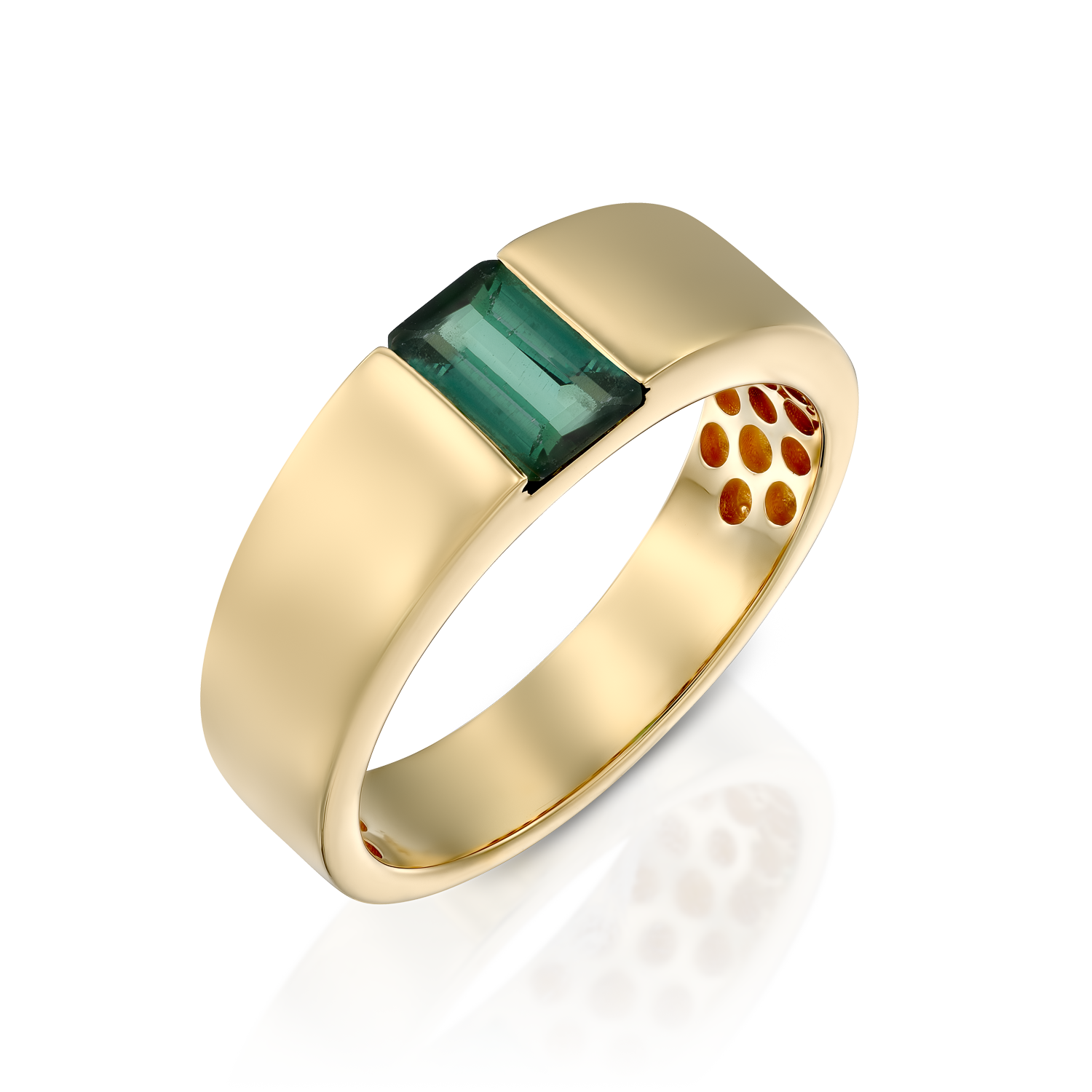 טבעת אליאור מעוצבת בהשראת המינימליזם העכשווי, עשויה זהב 14 קראט ובנויה בקווים נקיים ומדויקים, עם פס זהב רחב וחלק המדגיש אלגנטיות מודרנית. במרכזה משובצת אבן טופז ירוקה בחיתוך גיאומטרי מוקפד, המשתלבת בצורה שטוחה עם גוף הטבעת ויוצרת מראה אחיד והרמוני. גווניה העמוקים של האבן בולטים על רקע הזהב ומעניקים לטבעת מראה עוצמתי ואלגנטי כאחד.