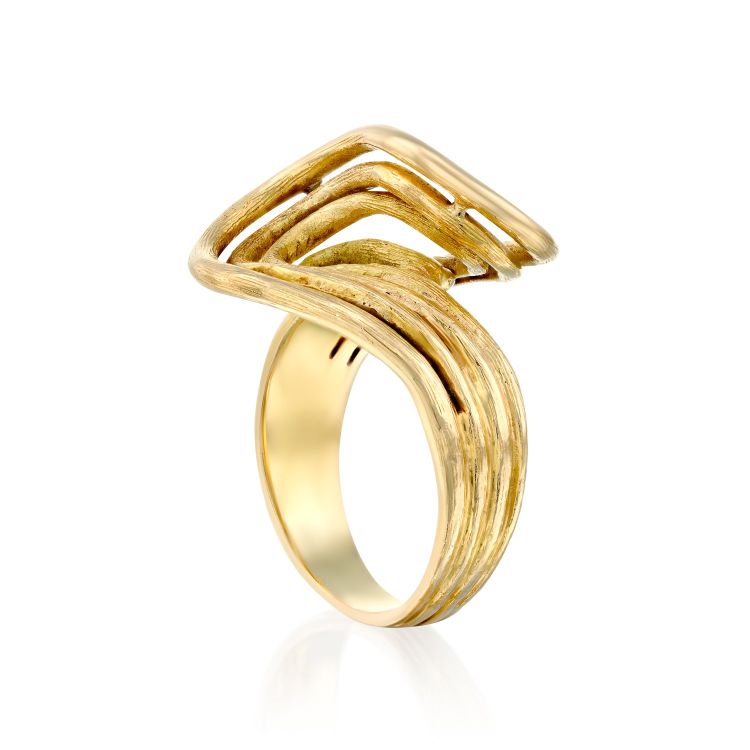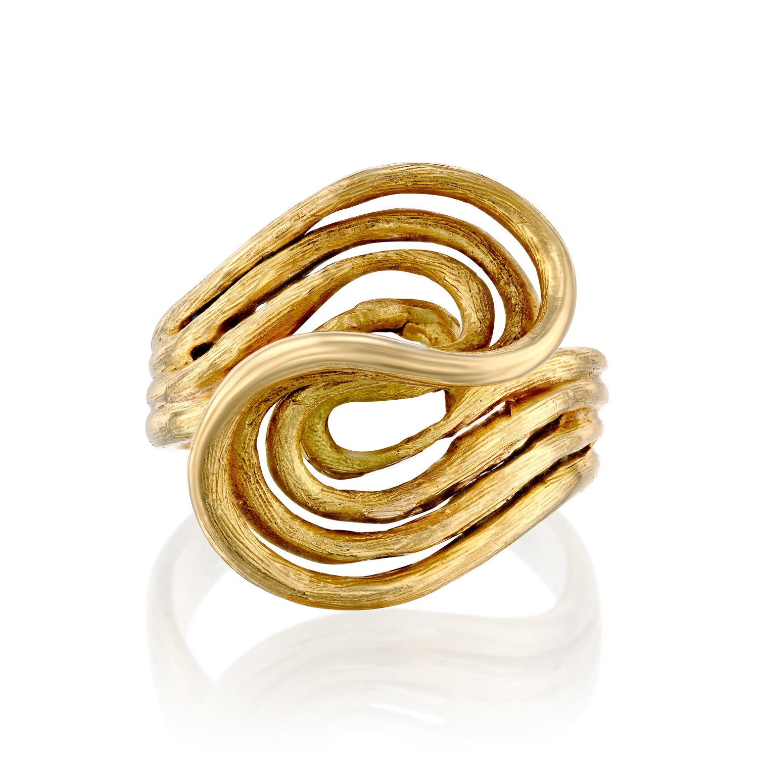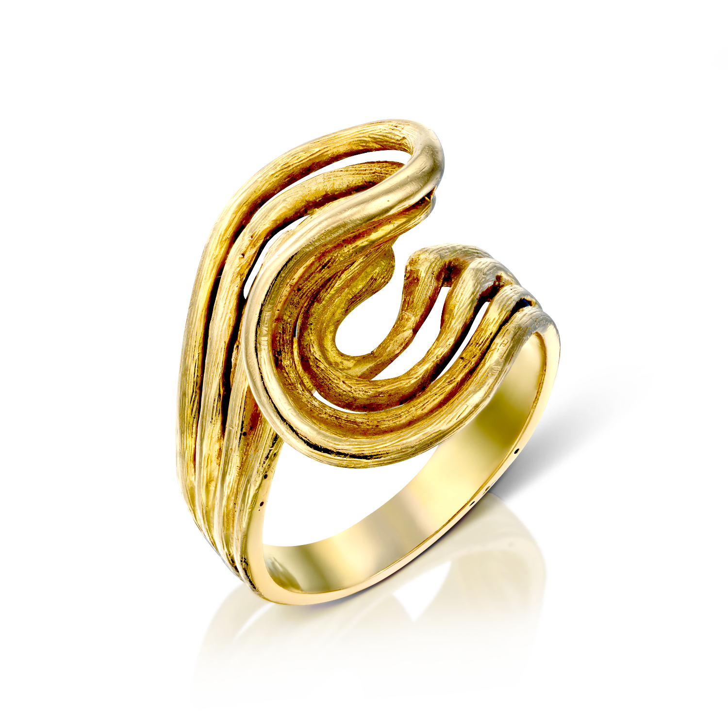 הטבעת מתחילה בפס פשוט ההופך בהדרגה לספירלה עדינה, שמעניקה תחושת תנועה רציפה – כמו טבעת העוטפת את האצבע ללא התחלה או סוף.