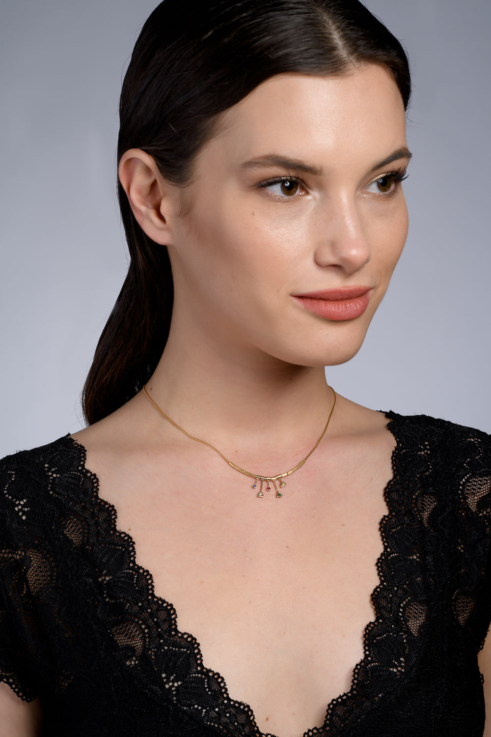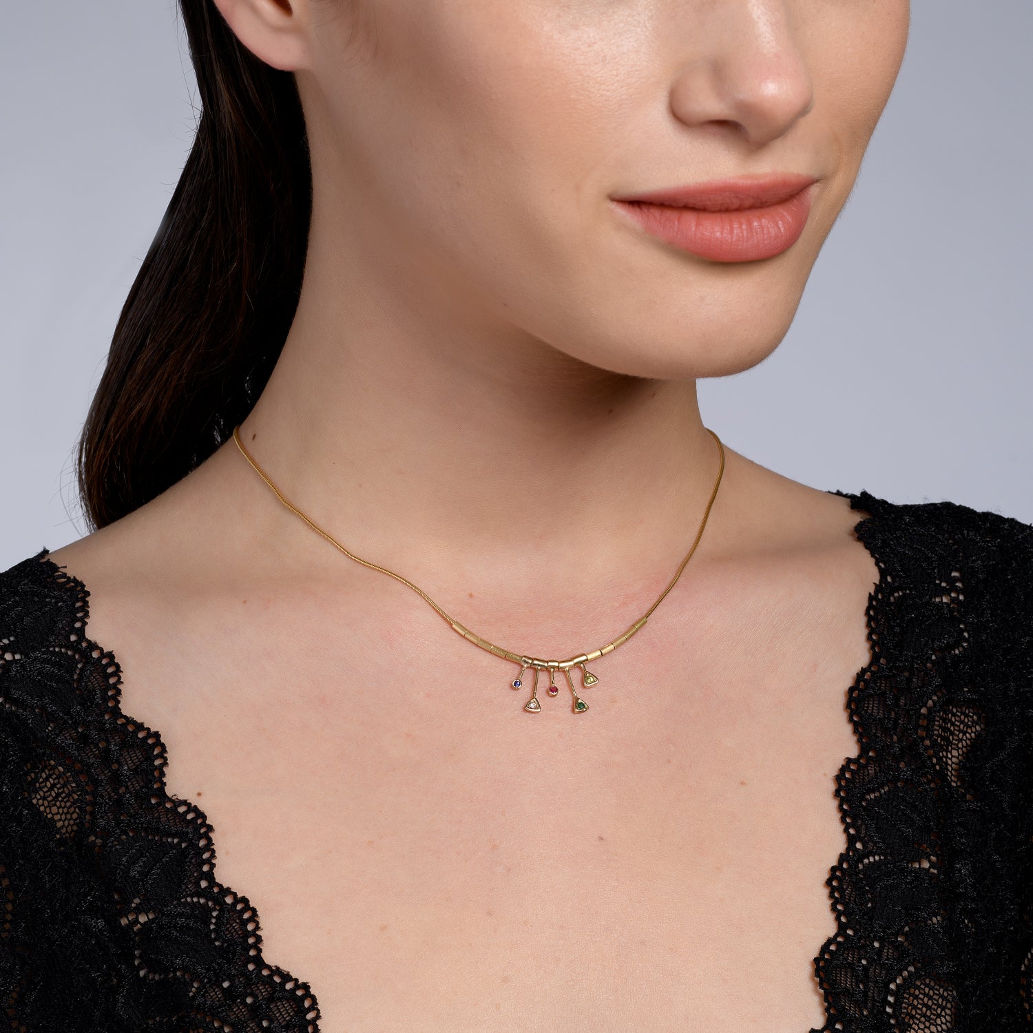 שרשרת זהב עדינה עם 5 תליוני אבני חן צבעוניים במרכז השרשרת.