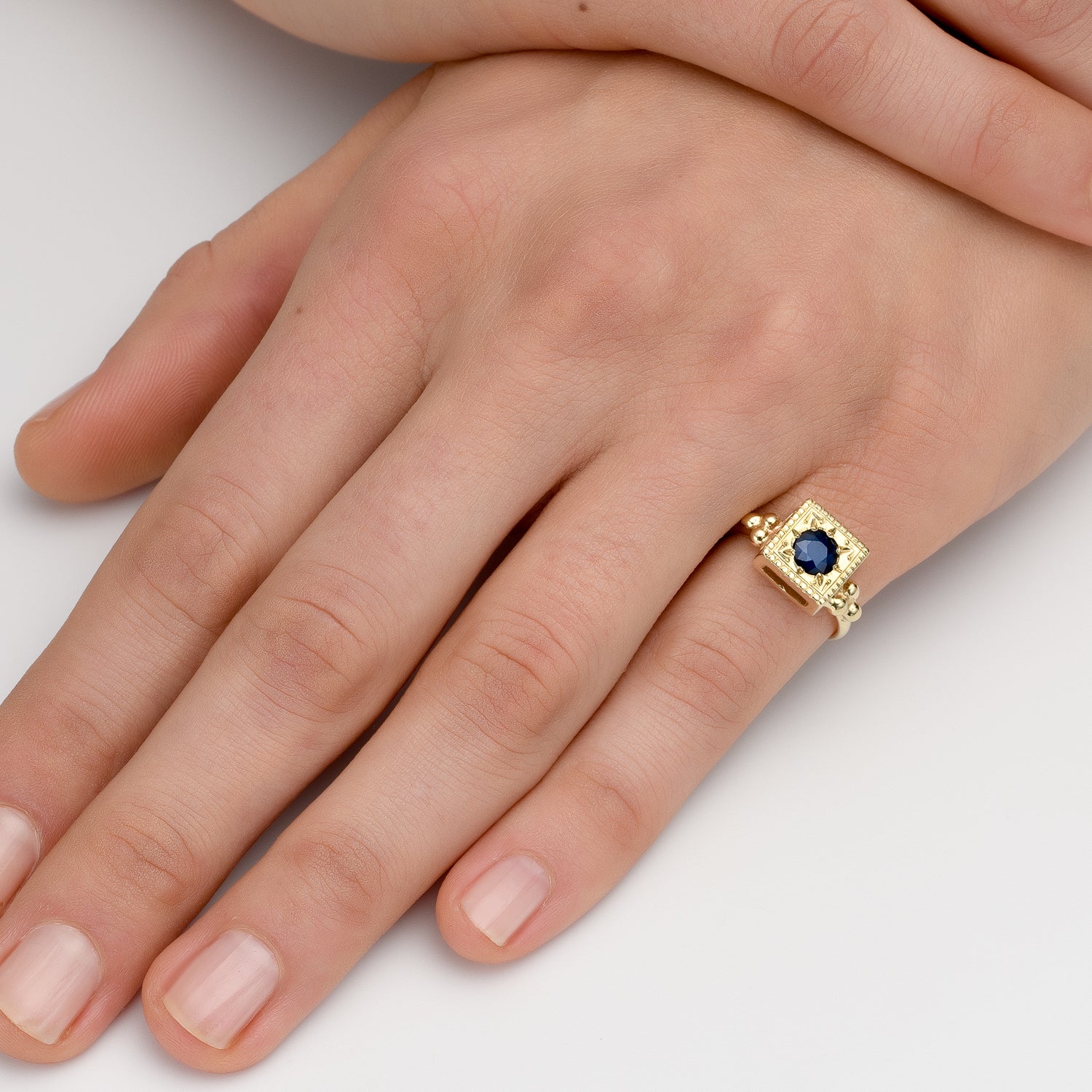 טבעת סופי עוצבה בהשראת הארכיטקטורה הגותית של צרפת ואנגליה במאה ה־13, ומשקפת את העושר העיצובי של ימי הביניים. היא עשויה זהב 14 קראט ומשובצת בספיר כחול עמוק, המוקף בעיטורים בעבודת פיליגרן עדינה. השילוב בין הגוון החם של הזהב לאבן המלכותית יוצר מראה הרמוני, קלאסי ובעל נוכחות. טבעת סופי מהווה שילוב מדויק בין אלגנטיות, עידון וקסם תקופתי.