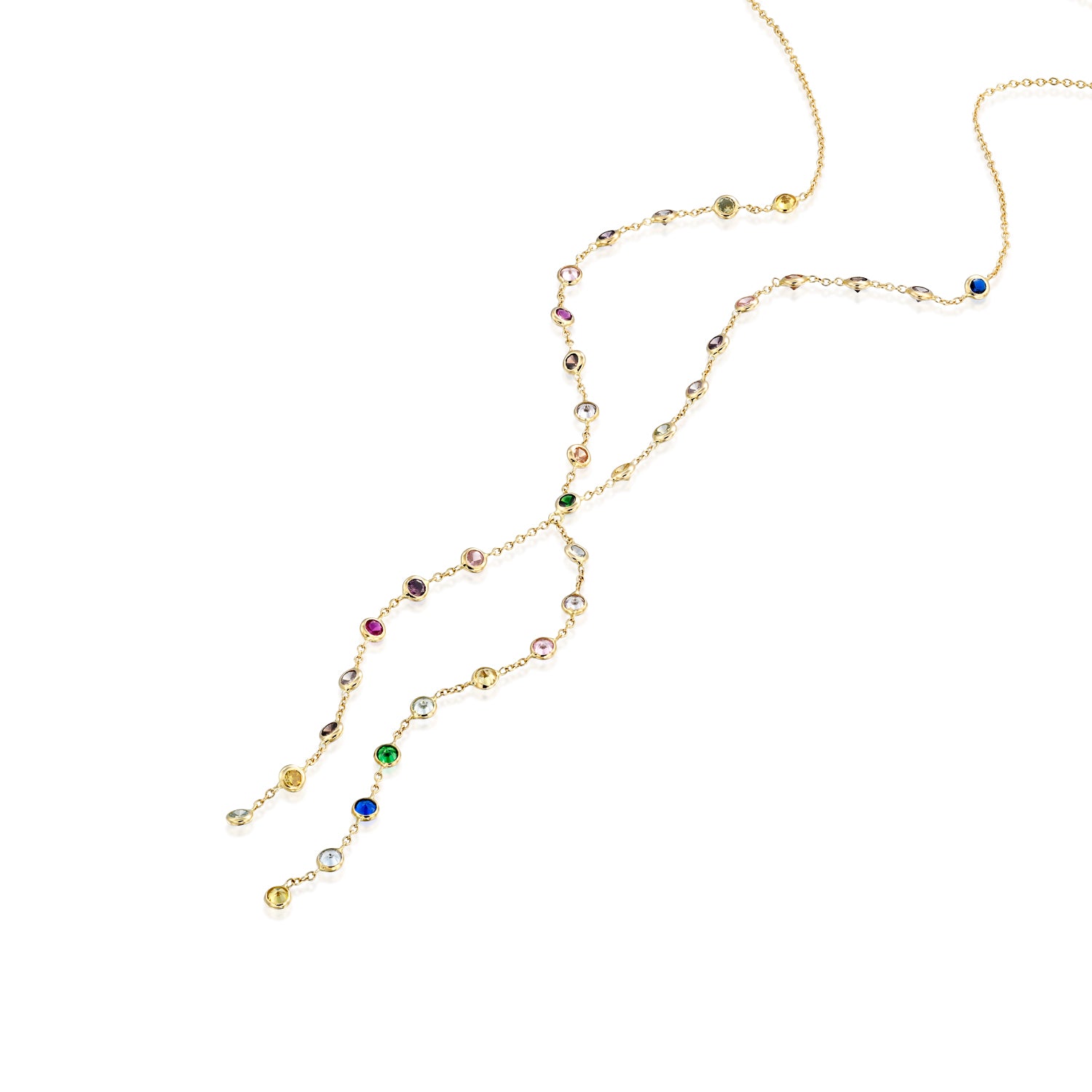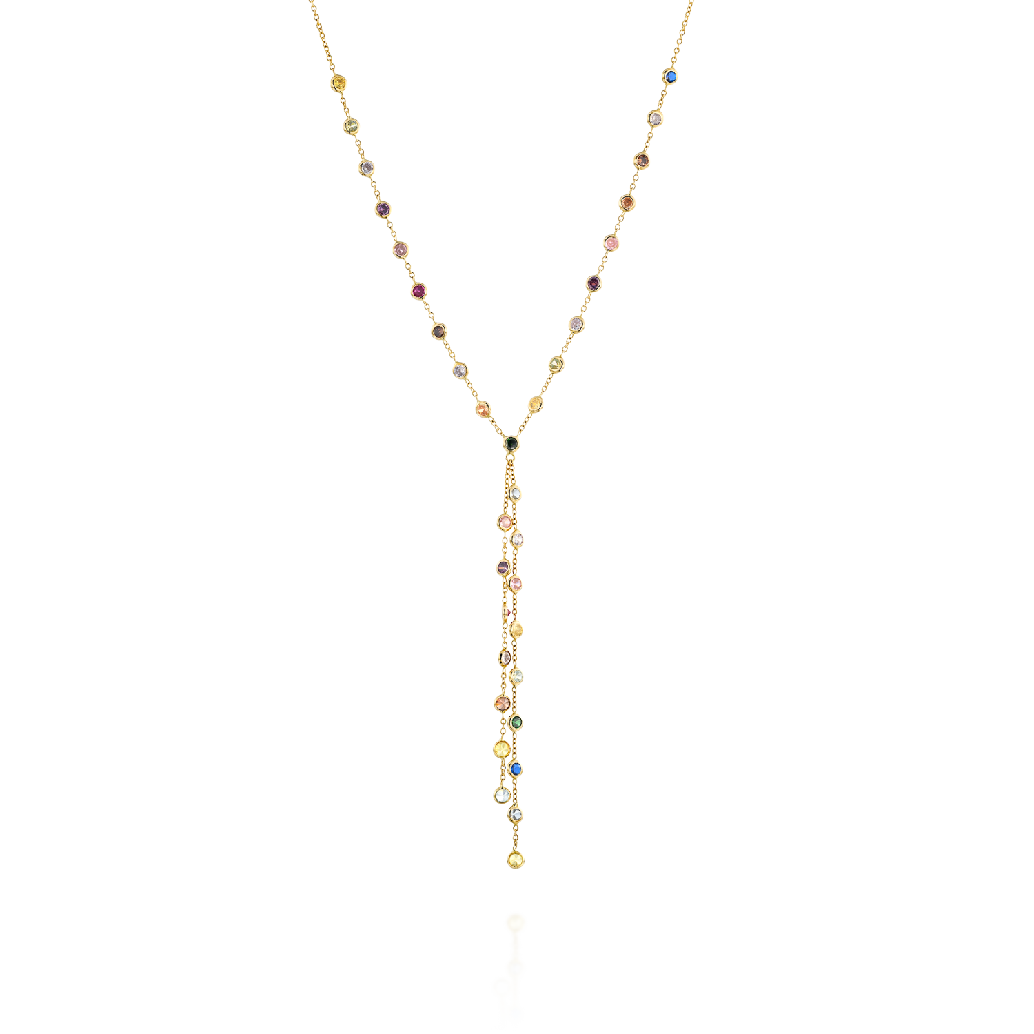 The Tie Rainbow necklace features a delicate gold chain adorned with vibrant semi-precious stones. Its cascading, tie-inspired design adds a graceful touch of color, combining elegance with modern simplicity. Perfect for those who enjoy refined, colorful jewelry.